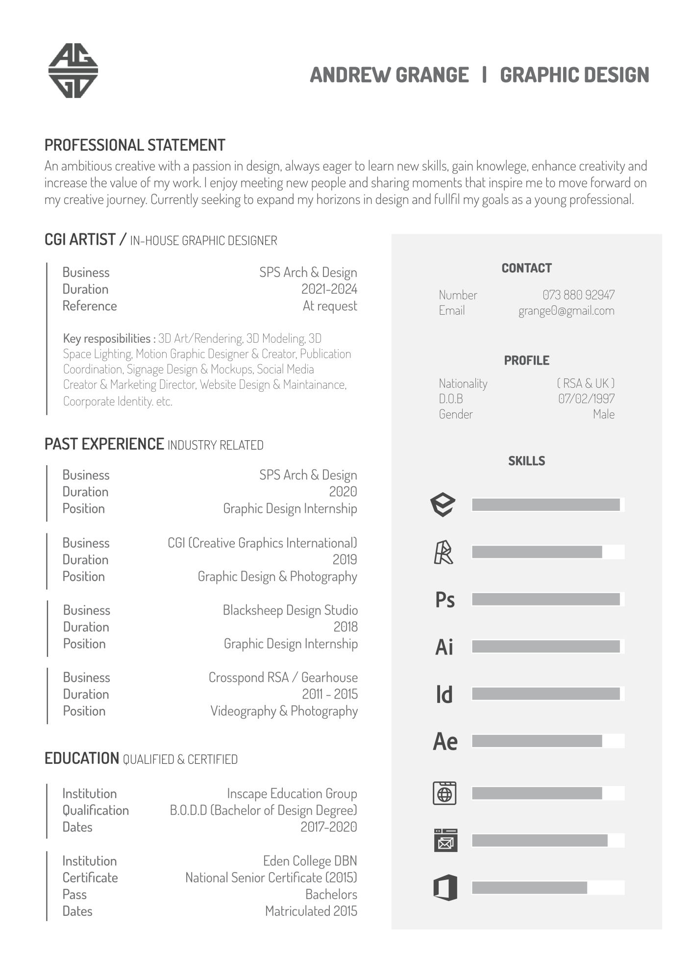 A young problem solver with an enthusiastic creative flare and an infinite desire to connect with other creatives that have mutual passions in design. As a passionate and ambitious individual, self improvement fuels my thriving development in the design industry. I am eager to learn new skills and knowledge, along with an excitement to share knowledge that I have learned on my journey in design. Although I have a high level of interest in all areas of design, the list below indicates what I enjoy doing the most -